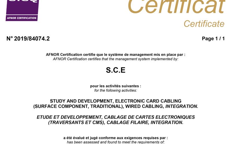 Créé en juin 2000, SCE est spécialisé dans l’assemblage, le montage et le câblage de carte électronique ainsi que le câblage d’armoire électrique et bancs de test.